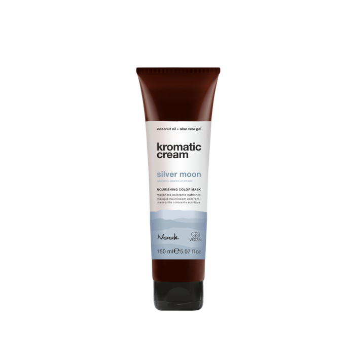 Nook Kromatic Cream - Silver Moon er en farvegivende hårmaske der neutralisere varme og gyldne nuancer i lyst og afbleget hår, så farven bliver mere kold, lys og klar. Masken giver en smuk silver nuance i håret og tilfører samtidig fugt og pleje til håret. Denne nuance er perfekt til dig med lyst eller afbleget hår, der ønsker at tone dit hår, så du får en mere kold nuance. Vil du gøre Silver Moon mere naturlig og knap så kold, så kan du med fordel blande den med White Gloss, som er en gennemsigtig nuance. Du kan også med fordel blande Silver Moon sammen med for eksempel French Rose, hvis du ønsker en mere kold, sart rosa nuance i dit hår.